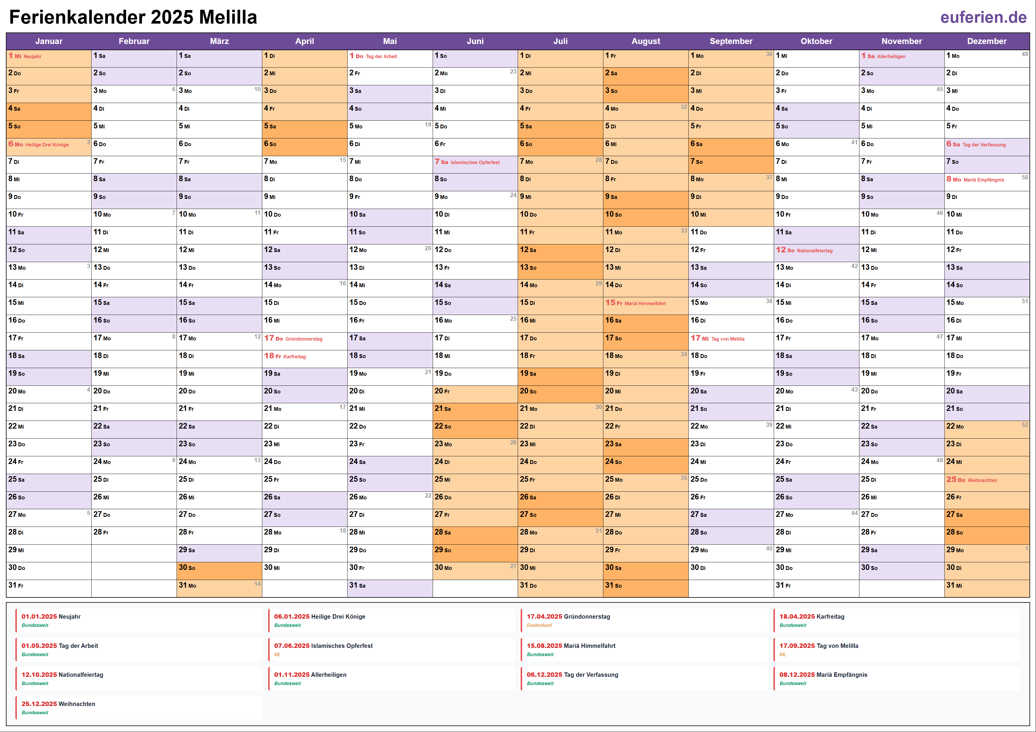 Ferienkalender Melilla 2025 herunterladen