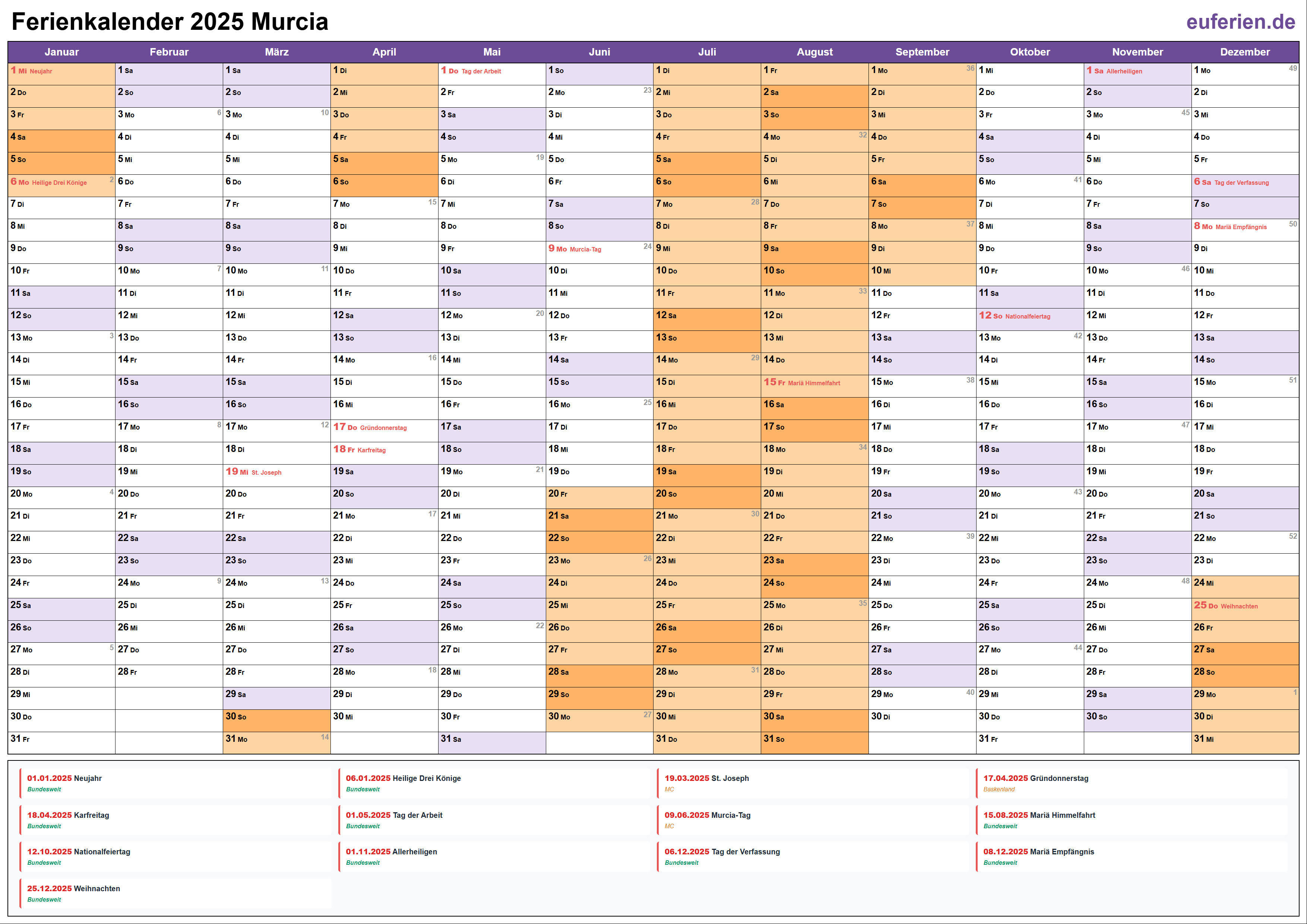 Die Ferien in Murcia umfassen Winterferien, Osterferien, Pfingstferien, Sommerferien, Herbstferien und Weihnachtsferien. Die genauen Zeiträume können je nach Jahr variieren und sind hier vollständig und aktuell aufgeführt.
