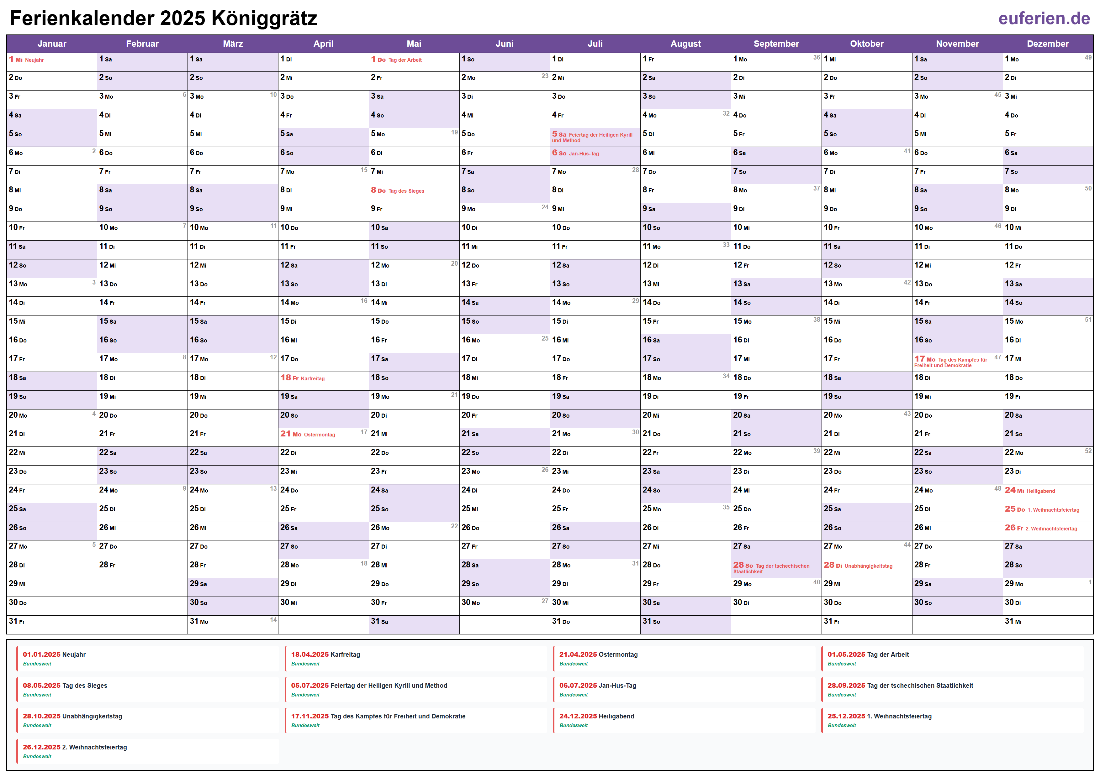 Ferienkalender Königgrätz 2025 herunterladen